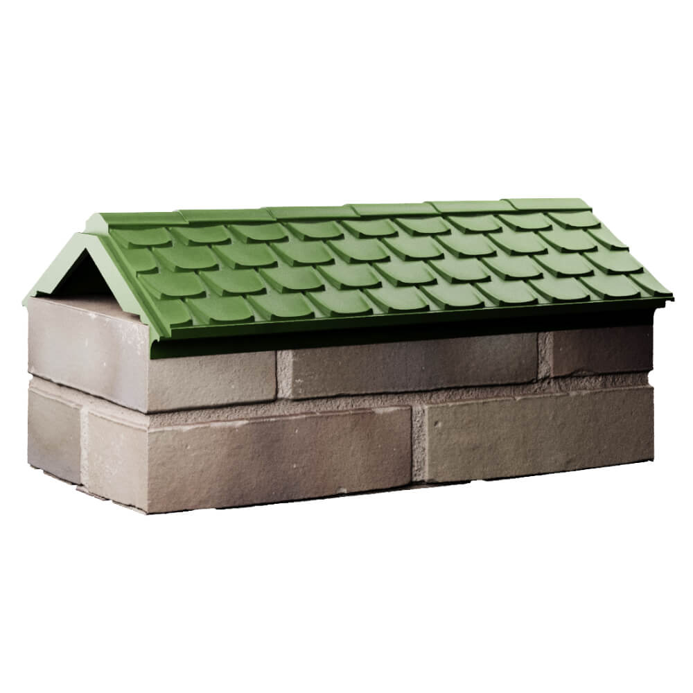 Парапет Elbrus Зеленый 303 х 510 х 105 мм с посадкой на 1 кирпич (255 мм) под натуральную черепицу может быть применен как в цокольной, так и в верхней части забора в виде конька.